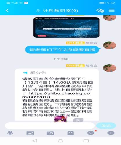 12月4日下午14:00点,胡晓容老师组织计算机科学与技术教研室全体教师认真收看了四川省一流本科课程建设与申报培训会直播,围绕指导思想、建设原则、建设内容、建设目标等方面认真研究了《教育部关于一流本科课程建设的实施意见》(教高〔2019〕8号)等国家级一流本科课程相关政策文件。