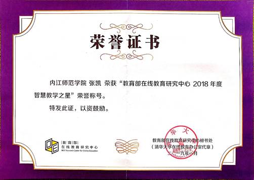 为推进信息技术与教育的深度融合,表彰在智慧教学创新模式的探索和应用方面有突出贡献的优秀教师,2018年11月,教育部在线教育研究中心开展了2018年度“智慧教学之星”荣誉称号的评选工作。经评审专家评议,公司计科学院张凯教授被评为“智慧教学之星”,这是学校运用先进的信息技术进行教学,积极推动“智慧教学”,认真贯彻落实党的十九大精神和全国教育大会精神、加快推进教育现代化取得的成绩之一。