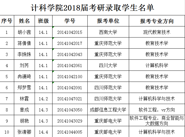 日前,2018年考研复试工作已落下帷幕,公司考研学子传来佳绩,10人确定被名校录取为硕士研究生,为计科学院2018年考研画上了圆满的句号。