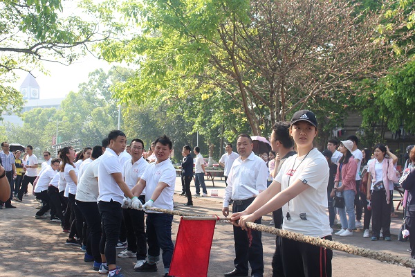上午的拔河比赛开始之前,公司老师进行了简单的准备运动。本次拔河比赛采用男女混合方式进行。每队30人,比赛采用三局两胜制。伴随着裁判的一声令下,两队队员立即投入到紧张而又激烈的比赛之中。选手们个个咬紧牙关,手紧握绳子,脚加足马力,身体往后倾。一旁的啦啦队员们纷纷为自己的队员加油鼓劲。加油声,欢笑声此起彼伏,热闹非凡。虽然公司以0:2的成绩遗憾落败,但是公司教职工努力拼搏的精神依然值得我们学习。