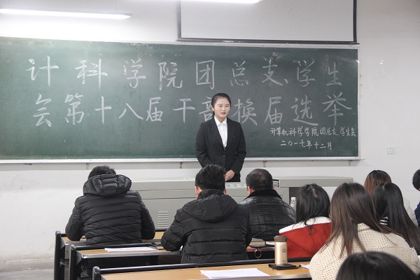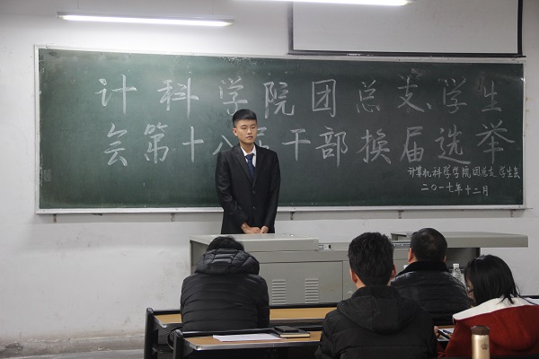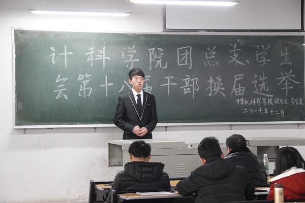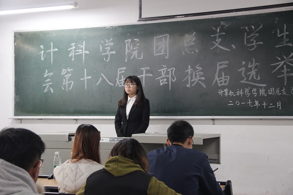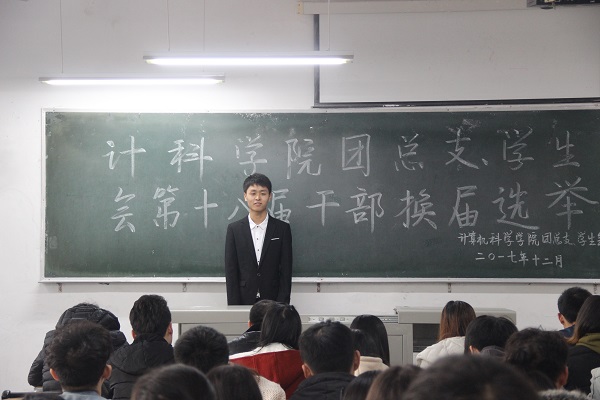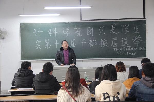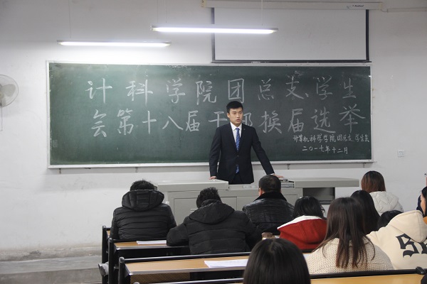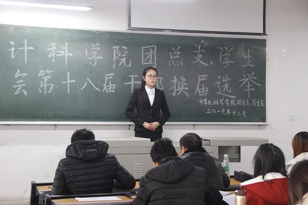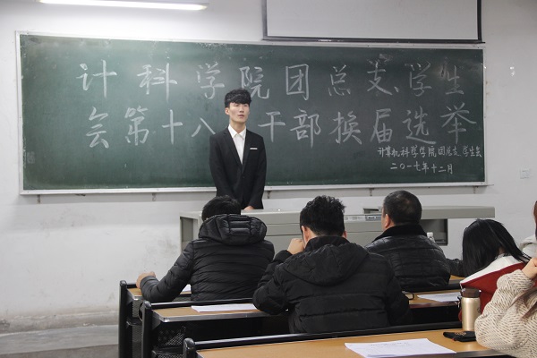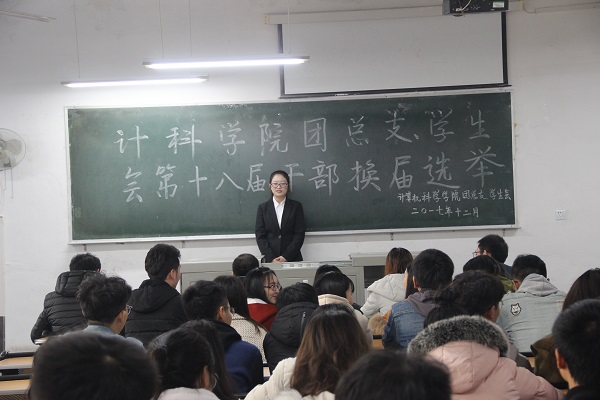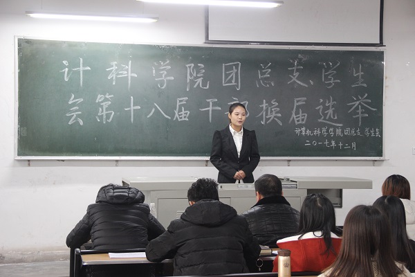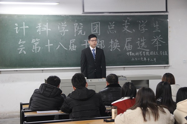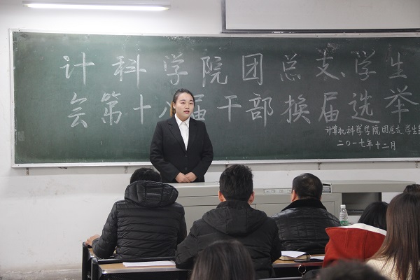 2017年12月2日下午1点,公司在一教401教室举行了第十八届团总支、员工会干部换届选举大会。出席此次会议的有党总支书记徐大军,学工办任主任吴昊,辅导员杨超、王晓芸,以及部分员工会干部、干事到场为候选人加油打气。
