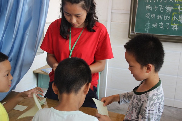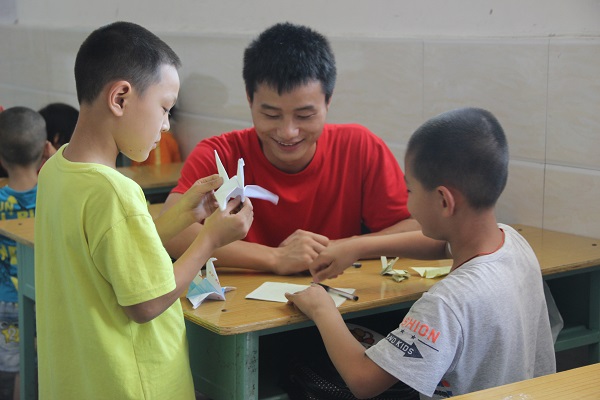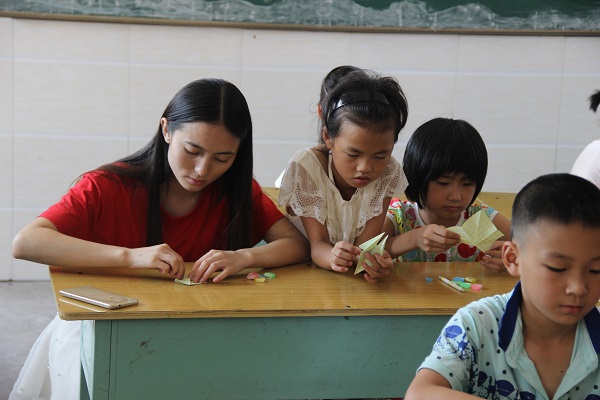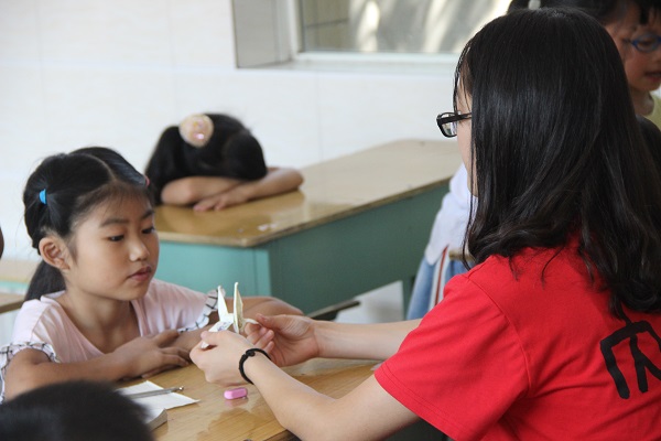 虽然炎热的天气,温度至33°,也抵挡不住孩子们好学的热情膨胀,但后勤组早已准备好避暑药品,以防万一。在教学过程中,队员们都极为认真的给孩子们指导,对于一些顽皮的孩子我们也是极力耐心的教导他们。不过大多数孩子都是很听话的,不管是学习还是娱乐都挺积极。尤其是在折纸过程中,孩子们对这个表现出了极大的兴趣,不过这个也是在意料之中的,也不枉折纸队员们看视频自学几小时。