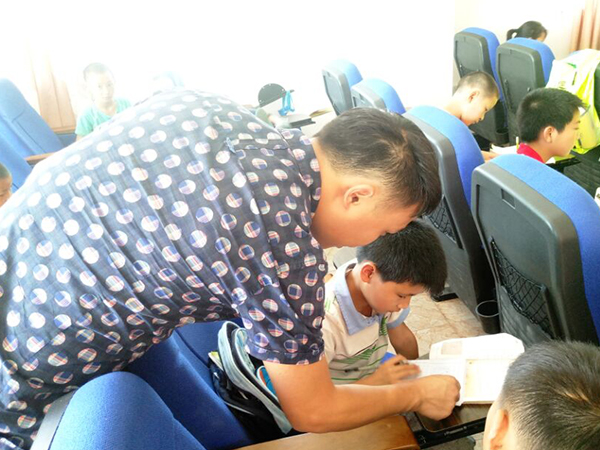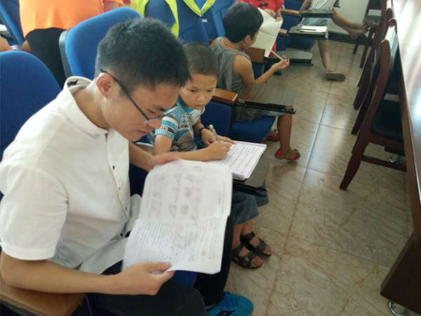 早上九点多,吴昊老师和杨超老师就来到了金紫铺村。首先得知支教小老师们刚刚教了孩子们爵士舞,现在正在给他们辅导作业,想象到他们认真学习的样子,两位老师忍不住先去教室看看可爱的孩子们。来到教室,两位老师看到孩子们正在认真的写着自己的作业,支教小老师们也在细心的解答,两位老师也忍不住给孩子们辅导了一些功课,就像对待自己的孩子一样耐心,画面十分温馨。