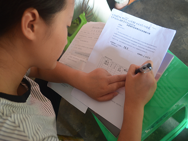 二、填写问卷调查,了解扶贫详情。工作队在走访过程中,访调组根据扶贫实施问题对村民们进行问卷调查,对该村的收入开支情况与扶贫政策落实等方面有了更详尽的了解。