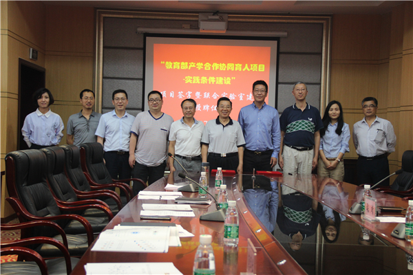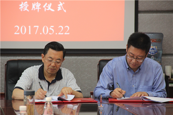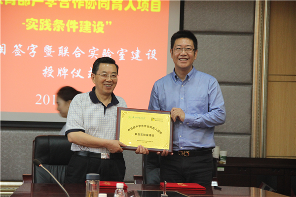 会议结束,副董事长曾良与副总裁张靖签订了合作协议,为校方授予了“教育部产学合作育人项目实践条件建设”牌并合影留念。