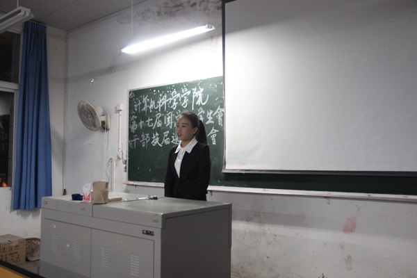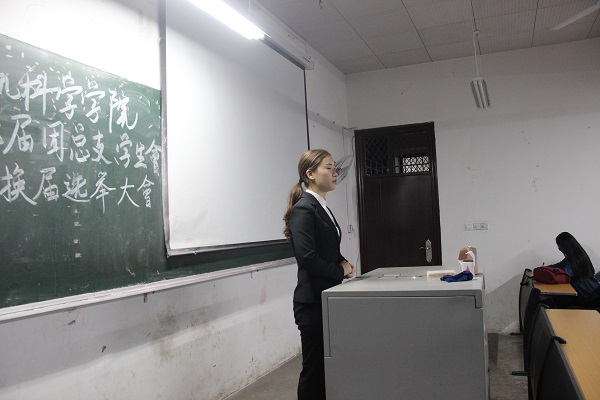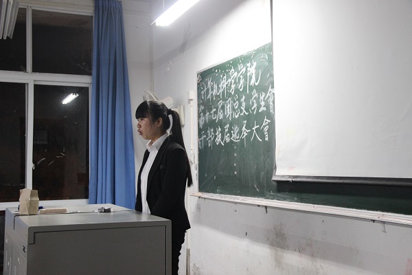 会议伊始,员工会主席王元祺就此次大会的目的做简单阐述,并介绍到场嘉宾。随后,主席王元祺分别介绍了此次9位候选人。他们分别是来自:团总支宣传部杨雪琴、实践部覃广琼,员工会学习部王松,刘春杨、体育部张伟楠,石欢和宿管部罗强,张长燕等。紧接着,他们相继上台为自己所竞选的职位作了阐述,同时对工作做了述职报告,如:自身特点、对部门的认知、对自己工作的总结以及对于员工会的改进与未来发展方向等方面。他们都本着求真务实的态度,为着服务老师和同学而努力。