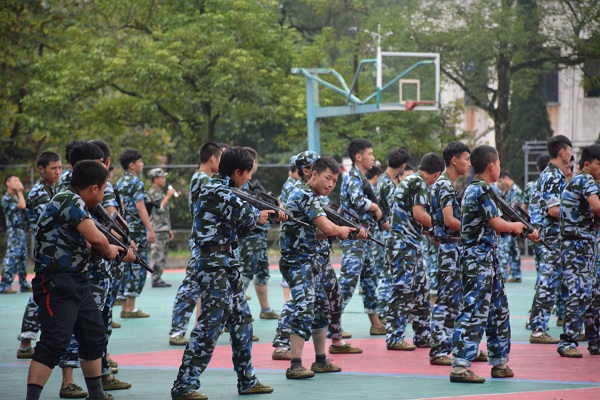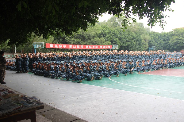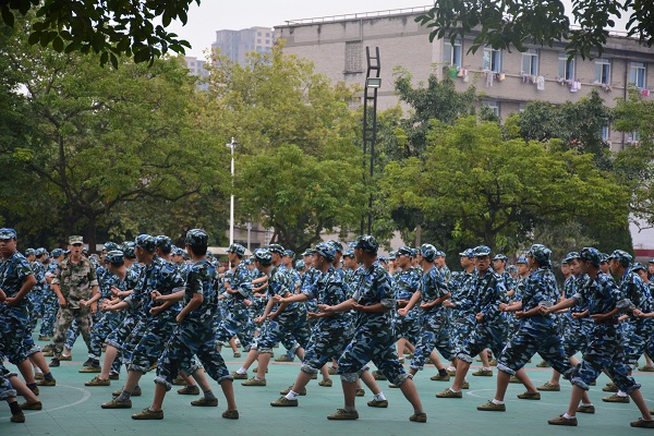 9月16日,今天是新生们分连队后训练的第三天。公司学子除了田径场的分列式方队,还有在山顶球场训练的由男生组成的“防暴方队”,山腰球场的内务展示和朗诵表演方队,东区篮球场担负着拼字表演的女生方队等。