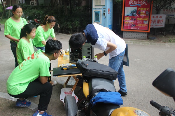 7月16号的清晨,天际已泛起了鱼肚白,预示着今天是一个晴朗的艳阳天。在电脑维修队队长的带领下,我们整装待发!奔向“金色夏威夷”——一个美丽的地方,也是我们即将开展工作的地方。队长和外联部的队员到小区的物业中心借桌椅,物业也十分热情。随之在男队员的帮助下,义务维修行的横幅被高高的挂在小区中心地段。公司组织计算机专业较强的员工到“金色夏威夷小区”进行电脑维修。烈日当头,在忙碌一个上午后,队员们也略显疲惫,坐在大树下乘凉。随之陆陆续续有许多居民上前询问,我队队员十分耐心的为他们解决问题。忙碌的一天就在我们的苦与累交替中结束了,在这一天中我们收获了很多。