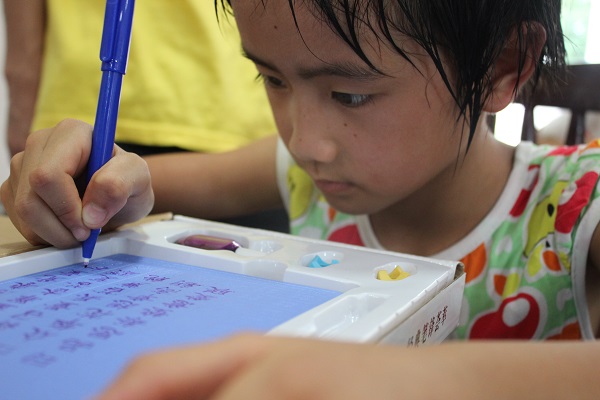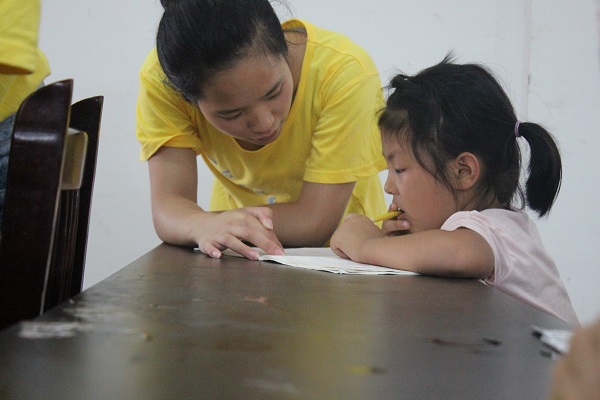 “一日之计在于晨”早晨是个学习的好时间,于是我队安排同学们拿出自己的暑期作业,在队员们的辅导下有条不紊地做着,但是小朋友终究是坐不住的,一会儿几个调皮的小男生就开始了乱跑、大闹的行为,着实让我们头疼。倒是高年级的同学认真做着作业,问着问题,一幅和谐欢笑的画面尽展眼前。时间总是流逝于指缝间,第二节课是音乐课,我们的汪瑾涵老师教他们唱起了四川版的《螃蟹歌》,整个教室充满着孩子们悠扬的歌声中。下午同学们总是来得那样早,然后展开属于他们的学习时光,不过接下来的则是小游戏和小手工制作。小学部孩子则是游戏:你比我猜。他们的脑袋里充满着各种奇思妙想,千奇百怪的答案一个更胜一个。当然初中生则是做着他们喜欢的玫瑰花,他们的笑容更是比花开的更艳丽。