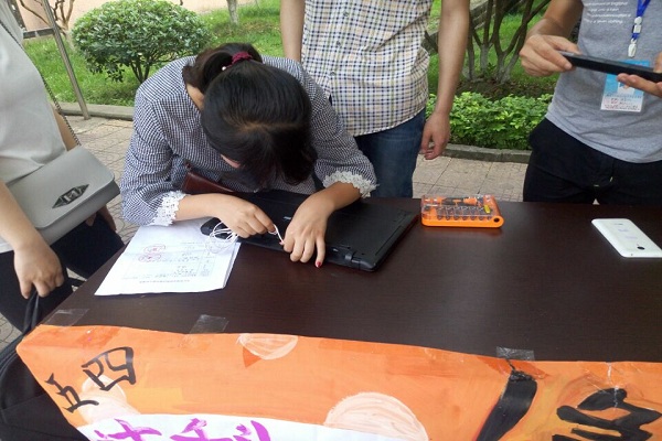 早上八点半,活动一开始就吸引了很多同学前来询问,维修员们忙的不亦乐乎。他们在各自的战场上,挥洒着热情、倾注着努力。电脑义务维修活动是结合自身协会特色、通过自己所学的专业技能、面向全校师生及校内办公室开展的义务维修服务活动,为全校师生解决在电脑方面遇到的各种疑难问题。维修期间,他们相互讨论,相互分享自己的想法,解决很多电脑常见问题。他们说:“我们不只是单纯的帮助师生维修电脑,更多是教会大家在遇到电脑问题时,自己找方法解决。在我们操作电脑的同时,跟同学们分享着自己面对这些问题的一些经验,让大家可以学会独自面对电脑小难题。”