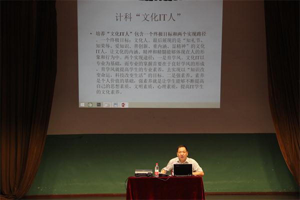 徐大军书记主要从角色转变、心态调整、目标重塑、职业规划等方面介绍了大学新生要注意的问题。在入学教育上,徐书记着重强调了“文化IT人”建设,他希望全体新生要养成良好行为习惯;养成基本文明礼貌意识;在学习中培养现代科学精神;向着“文化IT人”的目标努力奋进。