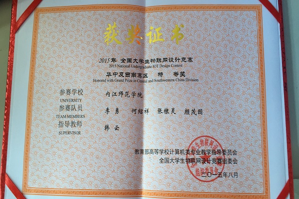 2015年8月4日-6日,2015年全国老员工物联网设计竞赛(TI杯)华中及西南赛区复赛在华中科技大学举行。经过激烈的角逐,计科学院韩云博士带领的李勇等四名同学在此次复赛中获得特等奖,成功入选全国决赛。
