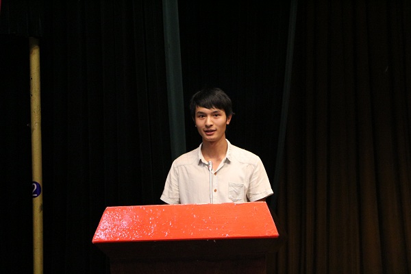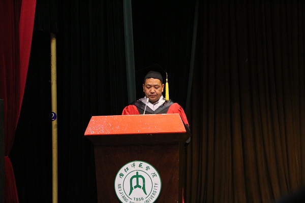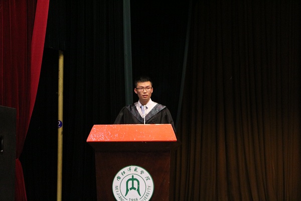 来自11级3班的蒲勇作为毕业生代表发言。首先,他代表全体毕业生表达对母校的不舍,感谢母校多年的精心培养教育,感谢各位领导及老师的教诲,感谢身边朋友的帮助。而后,总结大学四年的得失,表明自己对未来的态度及立场,表现自己对未来的憧憬,他们定将不畏艰险,怀着满腔热情投入到新征程中。随后,13级2班罗伟作为在校毕业生代表发言,今天,是毕业的日子,又是搏击长空的起点。他代表全体在校生表示对师兄师姐最诚挚的祝福,也表明自己的态度,请师兄师姐放心,请学校放心,请老师放心。他表明,在内师未来的日子里,会以更加饱满的激情投入学习及工作中。