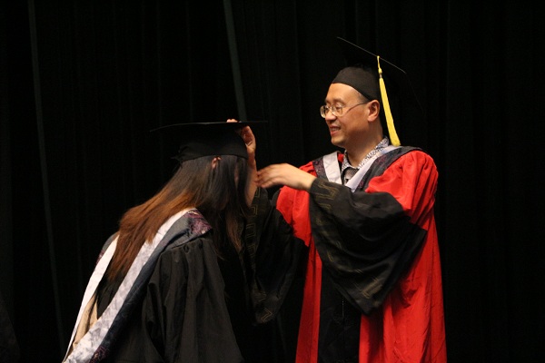 6点30分,西区礼堂前门口早已集合齐2014级全体员工及2013级、2012级的部分员工。待他们陆陆续续地进入西区礼堂坐定后,观看了简短的毕业视频,视频中展现的,是他们毕业生们昨日的点点滴滴,是昨日的艰苦奋斗,是昨日的欢声笑语,是临别前的依依不舍,是对未来满怀憧憬,是对美好将来的自信笑容。7点,仪式正式拉开帷幕,伴随着一阵热烈的掌声,身着红黑色导师服的校领导与学位评定委员会委员陆续入场。