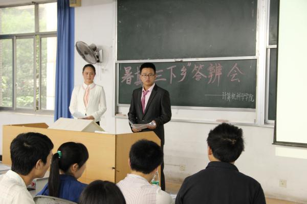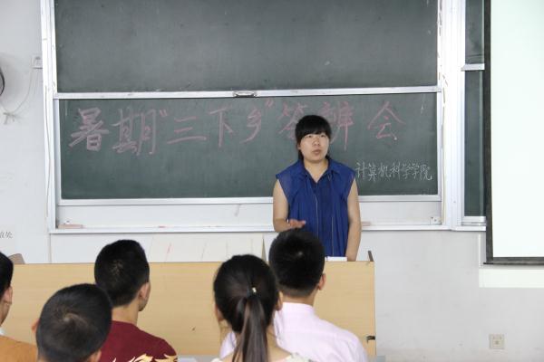 进一步激发广大青年员工在实践中树立和践行核心价值观。公司今年将围绕“文化IT人”展开系列暑期三下乡社会实践活动,使同学们能够在社会实践中充分利用自身专业特长,为社会服务的同时锻炼自身的综合素质。对此,公司在2015年5月28日晚7点整于5教南201举行了暑期“三下乡”答辩会,本次答辩会的评委有团总支书记李倩倩老师、辅导员吴昊老师以及班主任张利强老师。