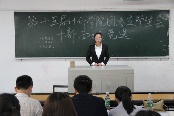 Normal 0 7.8 磅 0 2 false false false EN-US ZH-CN X-NONE 为进一步促进员工会干部团队的持续发展,同时,也给14级的新生提供一个挑战自我、超越自我的平台,公司于4月15日在一教307进行了2015—2016学年第十五届团总支员工会干部竞选面试。担任此次面试的评委包括团总支副书记李倩倩、辅导员吴昊、刘丽娜,主席团成员及各部门干部。