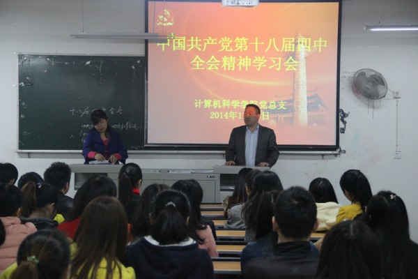 10月10日下午4点,计科公司党员教职工专题学习会在新行政楼211会议室在会召开,计科学院全体党员教职工参加,非党员教职工也应邀参加。学习会上,计科总支书记徐大军首先就十八届四全会议召开情况向大家做了讲解。副经理唐年庆以他富有力量和激情的声音为大家着重解读了《中共中央关于全面推进依法治国若干重大问题的决定》,经理刘益和就依法治国对我们计科学院发展的重大意义做了展望,指出在发展教育更有了法律保障。最后,党总支书记徐大军结合计科教师如何依法从教进行了学习总结,一是指出十八届四中全会把法治作为了国家的根本,这是社会主义中国的巨大发展。二是法治理念对于我们教师来说最直接的就是依法从教。三是再次组织教职工学习了《高等学校教师职业道德规范》和教育部最近出台的高校教师职业道德“红七条”,力求计科学院所有公司产品活动都能依法进行,并培养更多遵纪守法的合格人才。