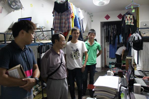9月24日晚上8点半,计科公司党总支书记徐大军、经理刘益和、副经理李尧、辅导员吴昊老师及2014级班主任张利强一行人来到男生寝室,进行走访慰问。