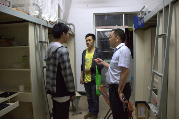 徐书记,李尧经理和班主任张利强老师来到了13栋大一新生寝室,书记不仅对寝室卫生做了要求,更是提醒大家要把学习放在首位,生活中要互相帮助,相互关心,尽快适应新的环境。刘益和经理及吴昊老师则来到了11栋和14栋寝室,一进寝室,经理便笑着问道:“都在干嘛呢?打游戏啊。”在经理的笑问之下,整个气氛变得十分轻松融洽,在一番谈论之后,经理表示大家可以劳逸结合,但不能沉迷于游戏中,要把学习放在首位,为以后的发展打下良好的基础。