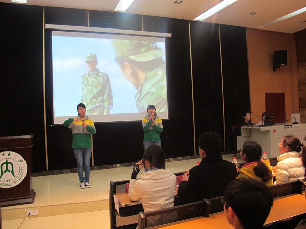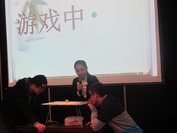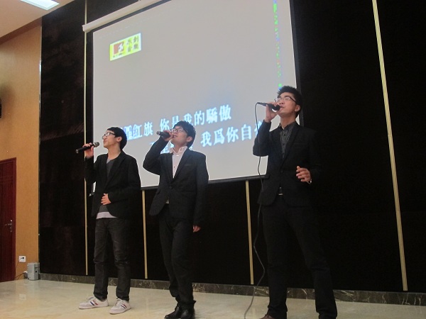 接着,观摩会进入了第二个环节——歌曲大PK。比赛上半场由2012级各班代表为观众们带来精彩表演,或寻梦奔跑风雨兼程的《奔跑》、或感受纯真友谊的《听你说》、或热血男儿,荡气回肠的《精忠报国》、或倔强昂扬,奋勇向前的《崛起》、抑或掀起全场高潮的《相信自己》无一不博得了在场观众的激烈掌声及阵阵喝彩。随后恶搞小游戏——吹乒乓球进行,引得全场哗然大笑。继续进行PK中,2011级3班的帅小伙合唱《五星红旗》振奋人心;《最长的电影》向我们诉说青春路上难免有伤。最后激烈洋溢的《相信自己》独领风骚,荣登榜首。