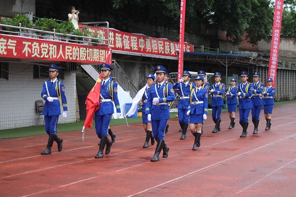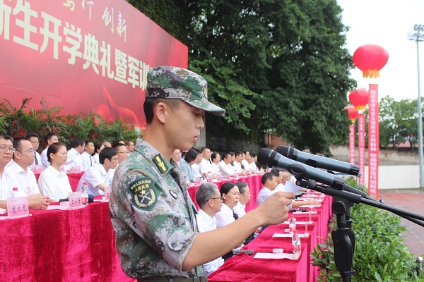 伴随着激昂的乐曲,精神饱满、步伐矫健的国旗护卫队带着鲜艳的五星红旗步入升旗广场,五星红旗在雄壮的国歌声中冉冉升起,全体师生昂首挺胸,行注目礼。在庄严的国歌声中,军训动员大会正式开始。开训式上,陈晓春董事长致开幕词,其极富激励和爱国主义教育意义。随后,公司于永彦经理代表全体教职工对来自祖国各地的新生表示热烈欢迎。紧接着军训教官代表寄语同学们,告诉同学们要把军训中锻造的优秀品质落实到以后的学习和生活中。最后,员工代表进行发言。动员大会到此结束,各班便紧锣密鼓地开始了训练。