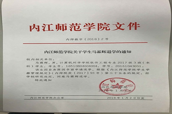 马霖辉,男,学号20161043031,系新葡的京集团8814计算机科学学院软件工程2017级3班员工,该生因自身原因于2017年12月29日提出退学申请,学院研究后同意马霖辉同学的退学申请,并报送学校审批。再经学校研究决定,对该生的申请予以批准。现将学校退学通知公示如下: